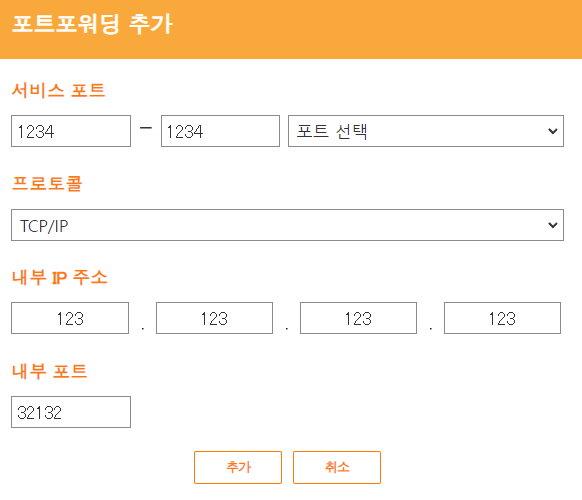 포트포워딩을 할때, 사진에서 볼 수 있듯이 서비스 포트를 1234로 정하였고,