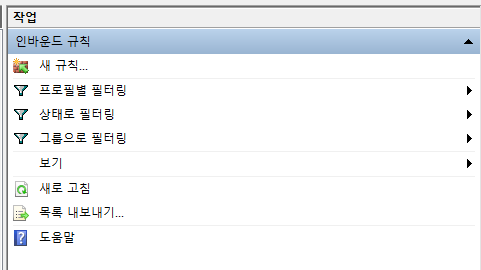 '제어판 > 시스템 및 보안 > Windows Defender 방화벽 > 고급 설정(좌측에 위치) > 인바운드 규칙' 으로 들어가시면 창이 하나 뜨면서 아래와 같이 '새 규칙'이라는 항목을 보실 수 있습니다.