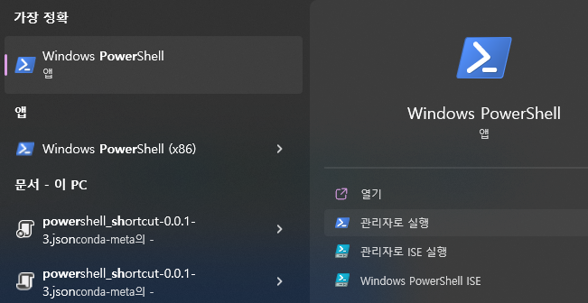 설치가 완료되면 'Windows PowerShell'을 찾아서 '관리자 권한'으로 실행을 시켜주시기 바랍니다.