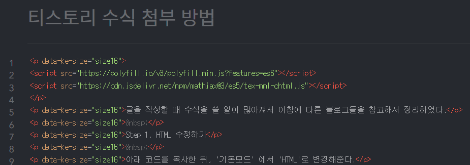 변경하게 되면 아래와 같이 지금까지 작성한 글이 HTML 양식에 맞게 변형되어 있는데,이때 위에서 복사한 코드를 제일 위쪽에 아래 그림과 같이 붙여넣어준다.