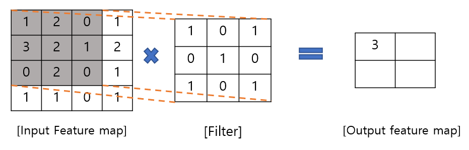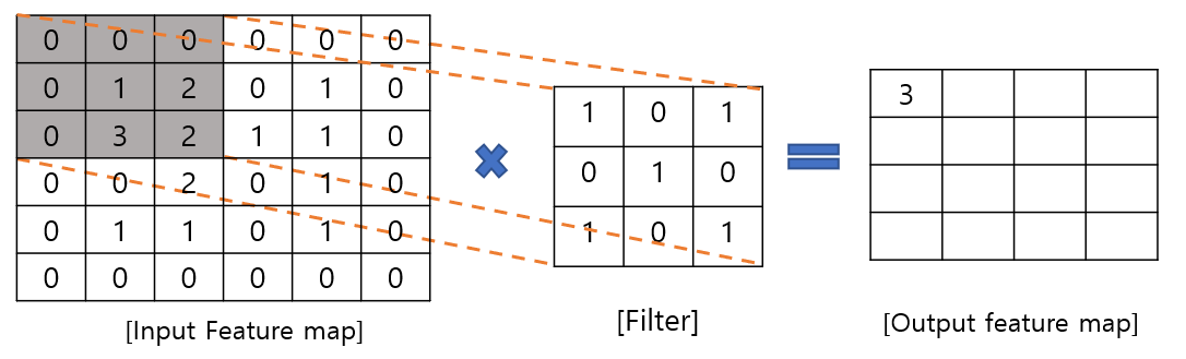 즉, 위에 예시는 1*1 + 2*0 + 0*1 + 3*0 + 2*1 + 1*0 + 0*2 + 2*0 + 0*1 = 3 이라는 연산을 수행한것을 나타냅니다.