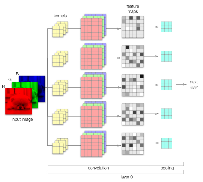 그림을 살펴보면 Convolution layer와 Pooling layer가 한세트로 묶여서 여러번 층을 구성한것을 확인할 수 있으며, 마지막으로는 Fully connected layer로 마무리하는 구조입니다.
