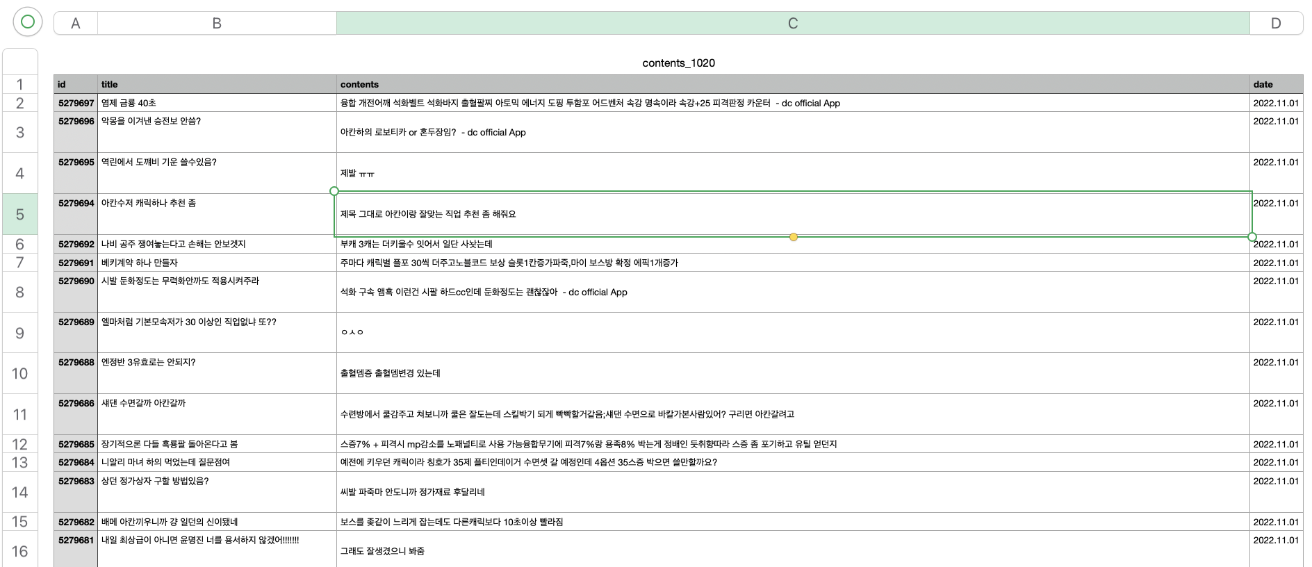 보시는바와 같이 게시글 ID, 게시글 제목, 게시글 내용, 그리고 작성일자가 올바르게 수집되었음을 확인할 수 있었습니다.