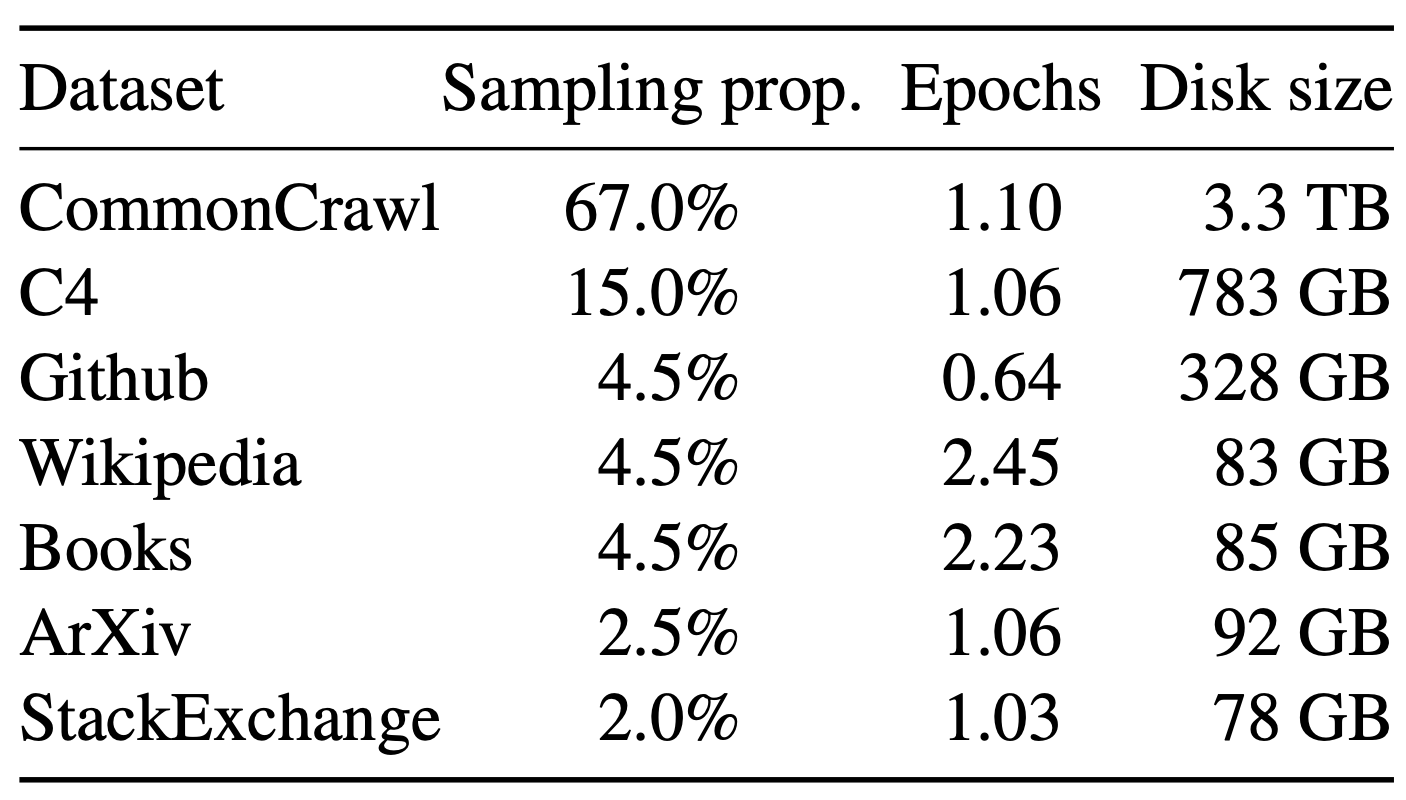 LLaMA 모델 학습에는 다양한 도메인의 데이터를 사용하였으며, 이들 모두는 타 연구에서 사용한 데이터 중 공개적으로 사용할 수 있는 데이터입니다. 각 데이터는 일정 비율을 샘플링하여 사용하였으며 샘플링 비율은 아래 테이블과 같습니다. 테이블 중 Epochs가 의미하는 것은 학습에 사용된 전체 1.4T의 토큰 중 각 데이터셋이 실제로 학습에 얼마나 사용되었는지를 의미합니다.