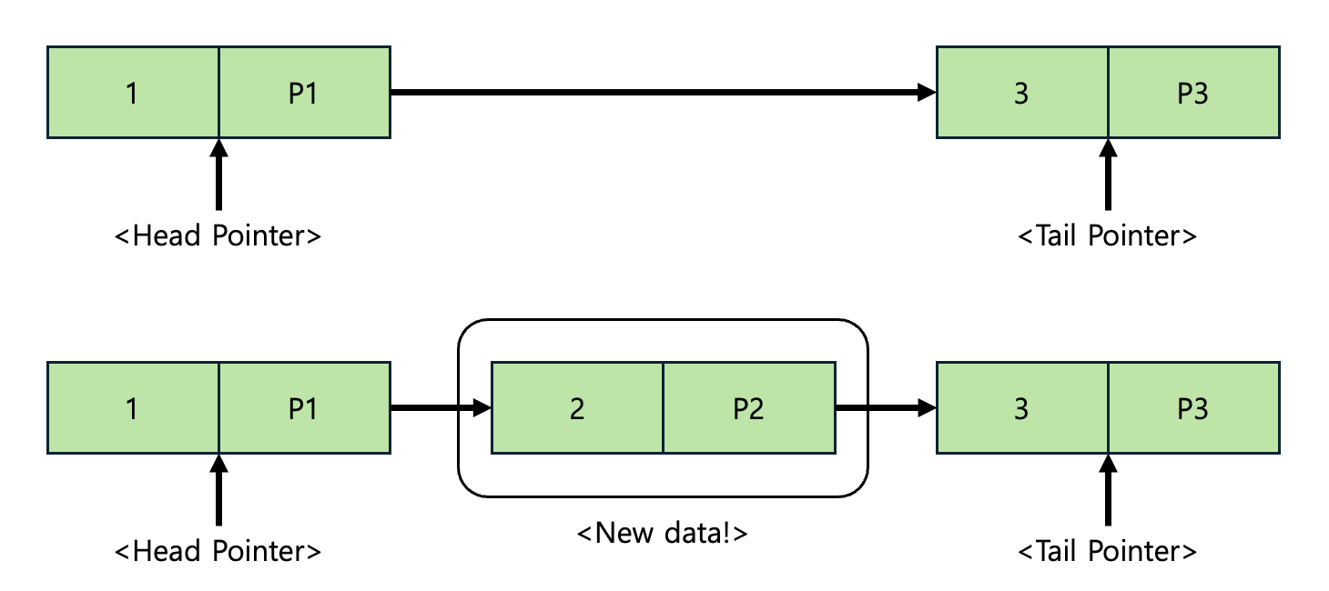 2. 연결 리스트 구현하기 - 삽입 연산 구현하기 : 데이터가 새로 들어오는 경우, 새로운 데이터를 Head 부분에 추가하는 경우, Tail 부분에 추가하는 경우, 그리고 노드 중간에 추가하는 경우를 생각해서 구현해야 합니다.