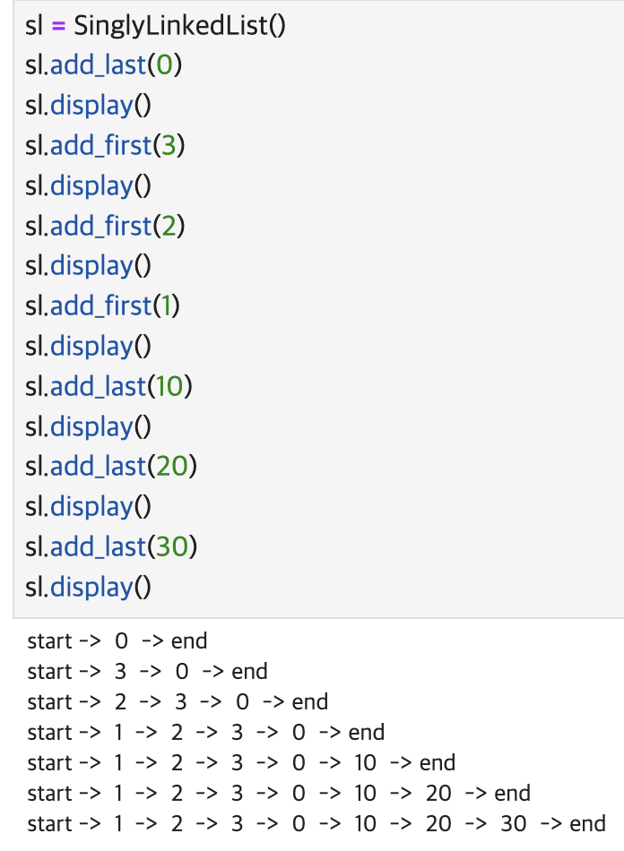 - display(self) : display 함수는 현재 Singly Linked List에 포함된 노드의 연결 관계를 보여줍니다. 연결 관계를 보기 좋게 표현하기 위해 시작 지점(start)과 끝 지점(end)을 표현하였으며, 연결 순서를 표현하기 위해 '->' 기호를 사용하였습니다.